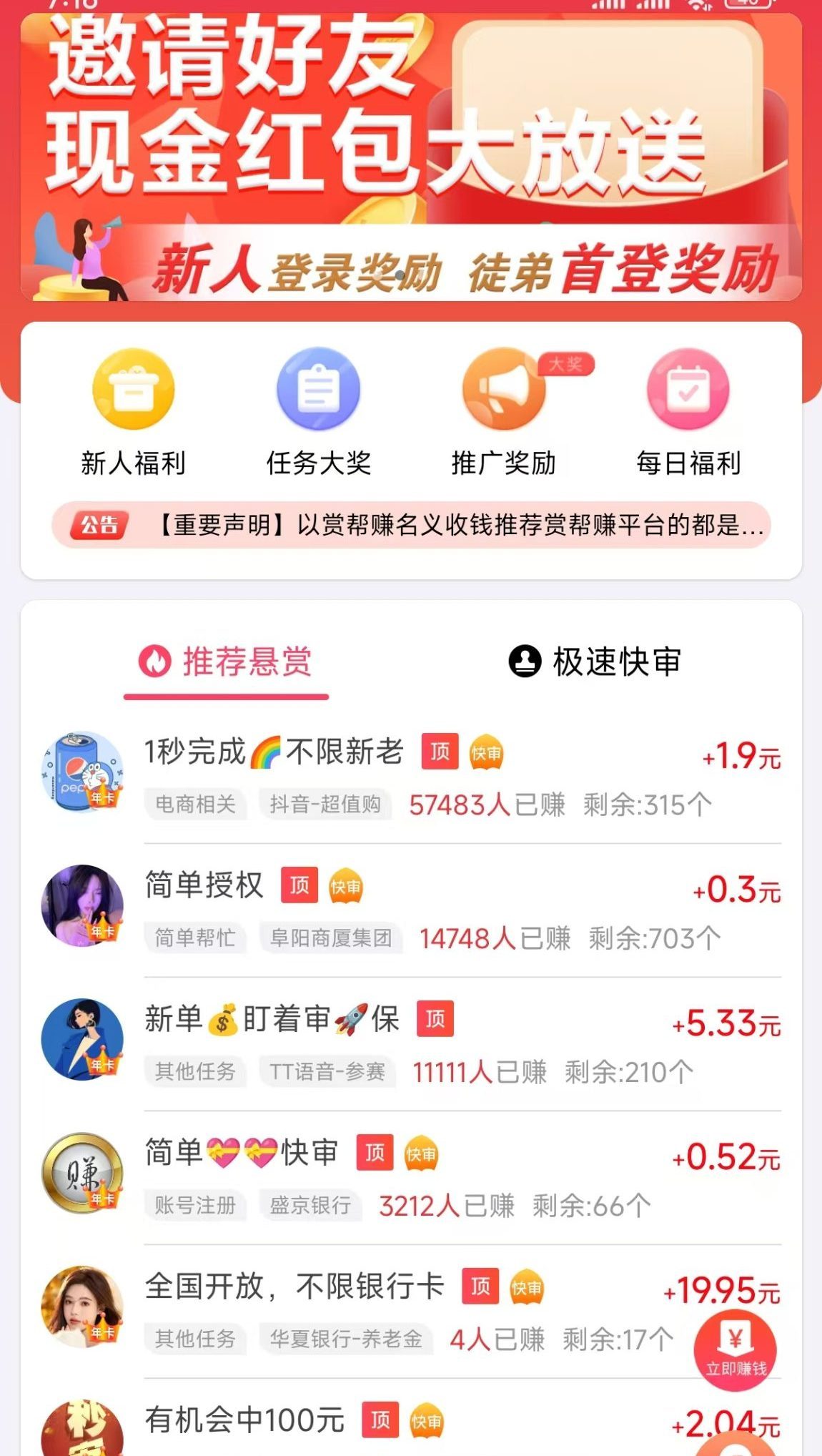 赏帮赚是由重庆优玖互邦科技有限公司推出的一款提供互帮、互助的悬赏平台。每天提供福利任务,手指点点红包到手。每日奖励:按照完全完成任务,可以获得阶梯奖励、奖励拿到手软。邀请好友:邀请一位有效好友可获得额外红包奖励;发任务:企业可定制专有服务。速度快:10秒发布需求,坐等搞定,所发布的任务由专职客服7*24进行审核。有保障:担保交易,满意再付,按效果付费。扫描下方二维码下载注册。