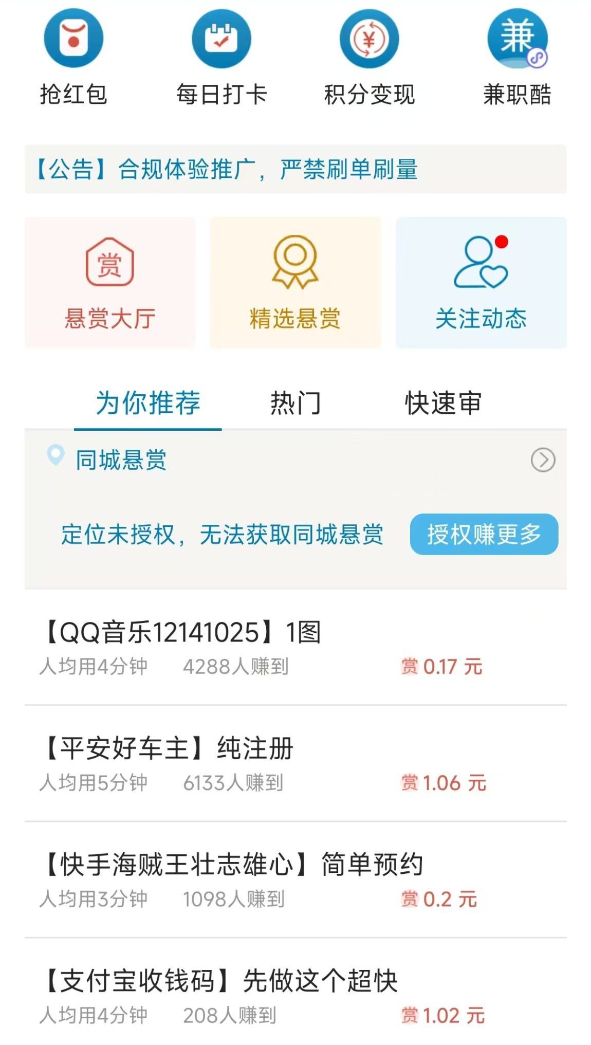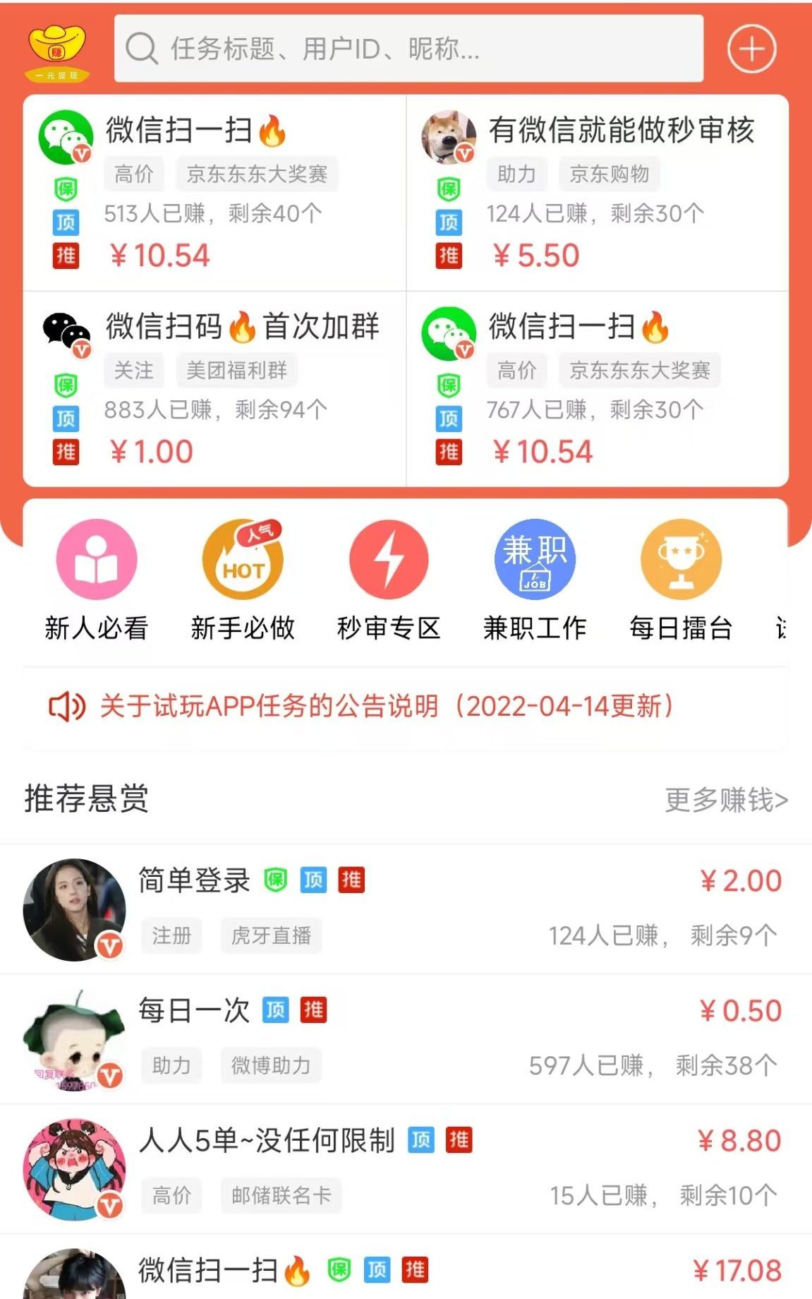 用户通过点击或者注册平台里面发布的悬赏任务获取报酬,主要有抢红包、点赞、浏览、评论、注册、游戏试玩等任务,用户也可作为雇主在平台发布悬赏任务。
