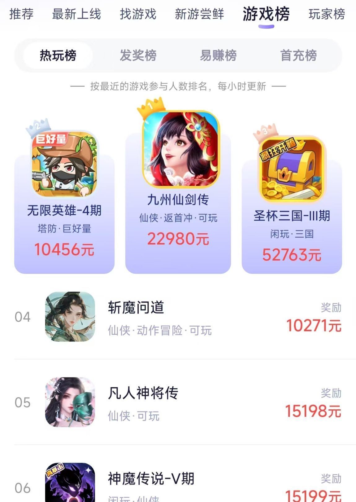游戏试玩赚钱软件平台是指用户根据平台要求试玩指定游戏,给游戏新区增加人气,吸引玩家,从而获取一定报酬的软件平台,以下给大家推荐几个运行时间较长的正规平台,在各大应用助手都可以直接搜索得到。
