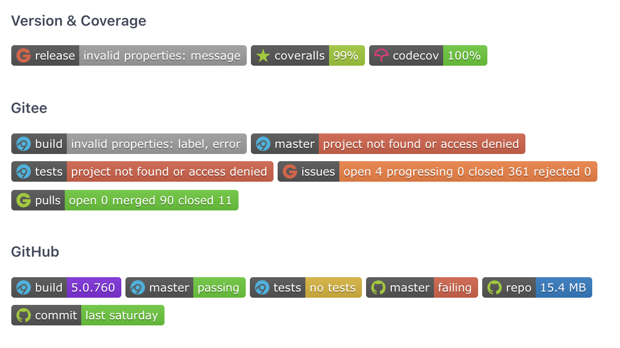 时在逛 Gitee、Github 等各大代码仓库时,往往能看到以下这种徽章式的网页链接,美观好看又方便,那么这个徽章是如何制作出来的呢?本文就带大家制作属于自己的徽章式链接。